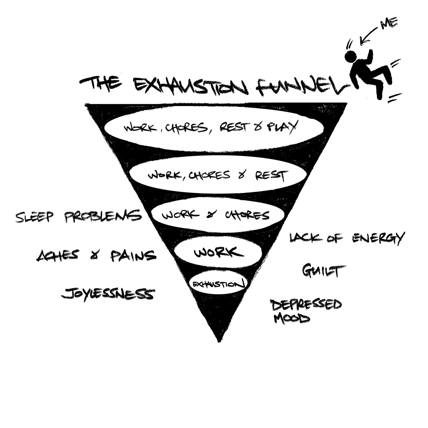 The Exhaustion Funnel, illustrated above, represents what can happen when life gets busier and more stressful.